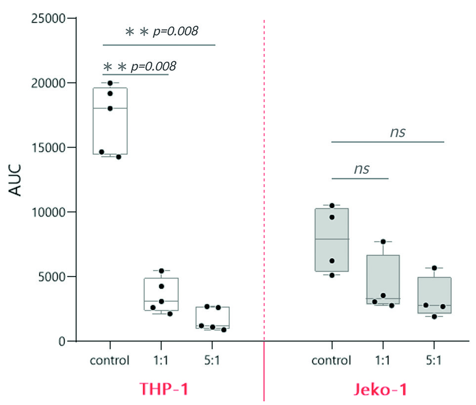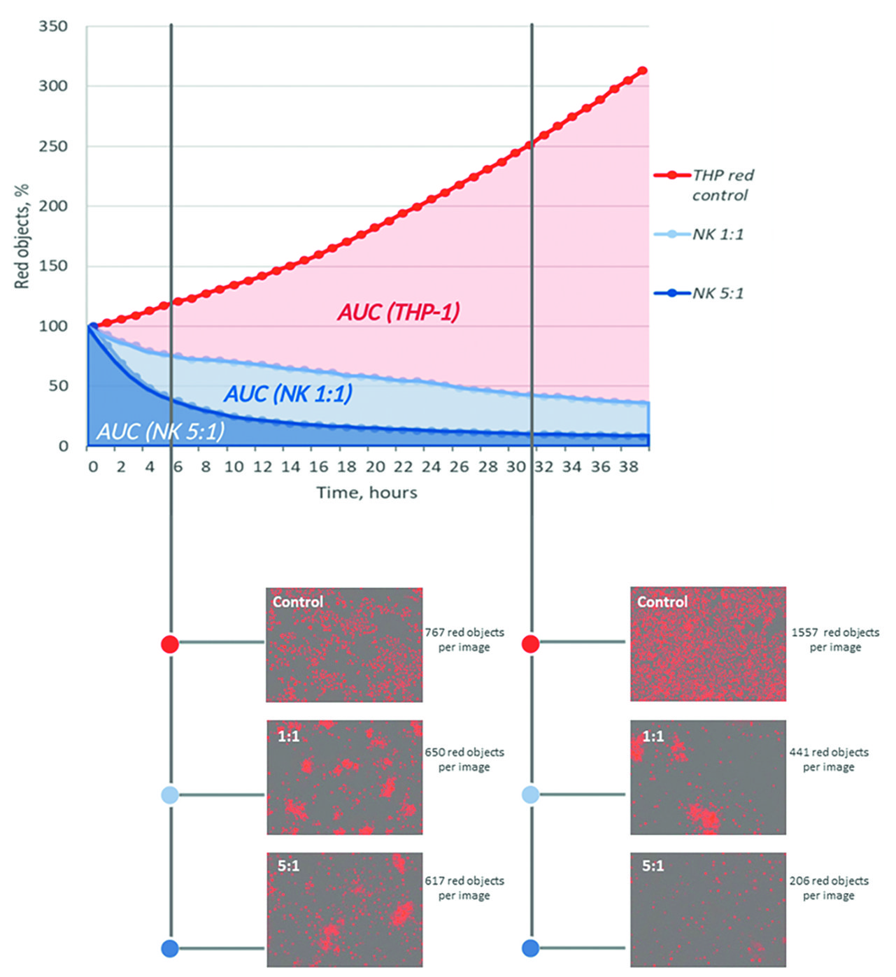 Полученный на 14-й день клеточный продукт соединяли с экспрессирующими красный флуоресцентный белок клеточными линиями THP-1 и Jeko-1 в соотношении НК:THP-1/Jeko-1 как 1:1 и 5:1, и проводили съемку на приборе IncuCyte S3 (Sartorius AG, Германия). Изображения регистрировали каждый час в течение 3 сут, а затем проводили их анализ с помощью программного обеспечения IncuCyte Software (v2019B) (Sartorius AG, Германия). Репрезентативные примеры исходного изображения и результаты его анализа представлены на рисунке 2. Количество красных объектов с течением времени отражает пролиферативную активность опухолевой линии, соответственно, НК БМКП считали функционально состоятельным, если он был способен подавлять пролиферацию бластов относительно контроля. Интегральным показателем пролиферации считали площадь под кривой (area under the curve, AUC) в координатах времени и количества красных объектов на лунку. Данные нормализованы к начальному значению красных объектов на лунку, принятому за 100%.