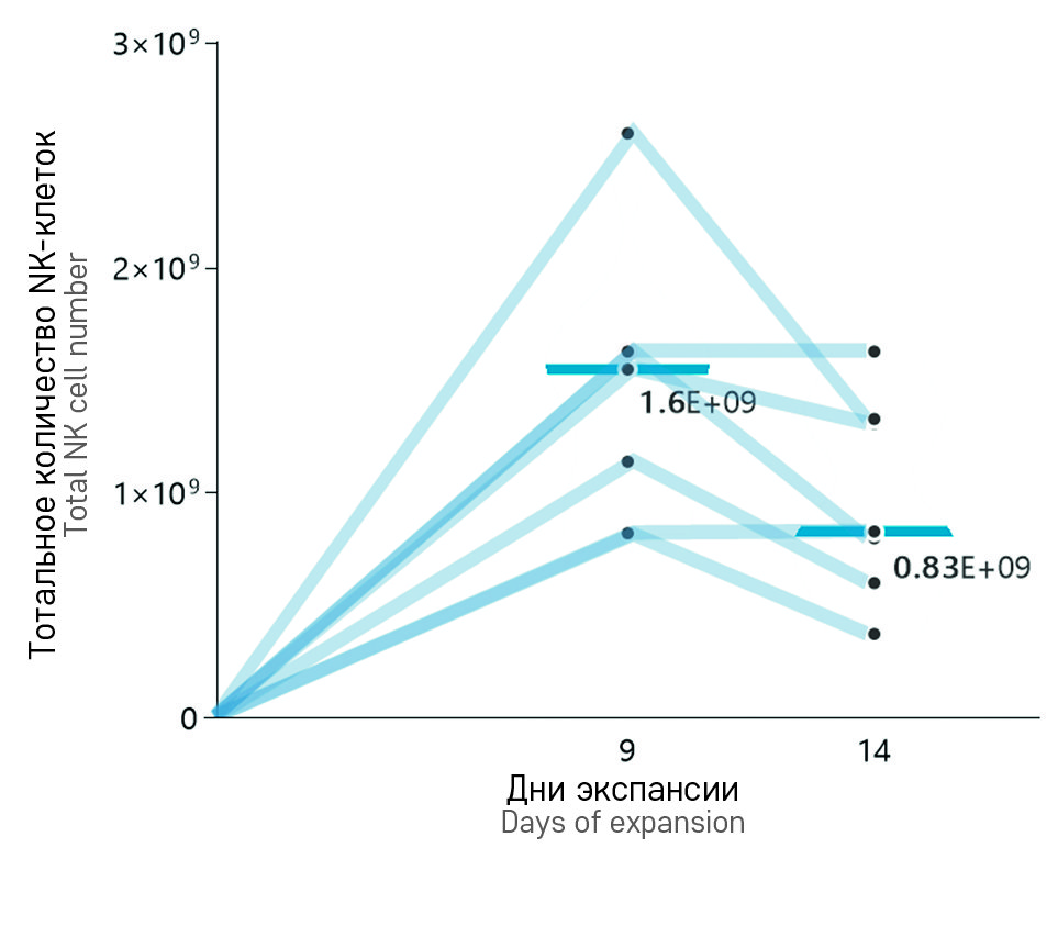 На 9-й день экспансии медиана тотального количества НК-клеток составила 1,6E+09 (от 0,82E+09 до 2,6E+09), что соответствует увеличению от стартового количества в 284 (194-650) раза, а на 14-й день - 0,8E+09 (от 0,39E+09 до 1,63E+09) и в 200 (96,5-406,7) раз соответственно. Динамика экспансии НК-лимфоцитов представлена на рисунке 3 с детализацией в таблице 2.