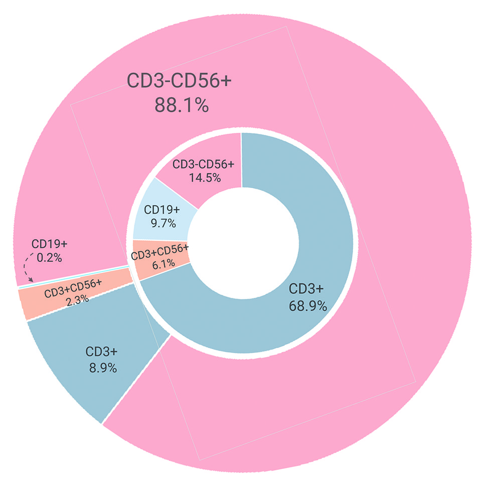 В стартовой фракции мононуклеаров медиана содержания НК-клеток ^56^3“) от всех лимфоцитов составила 14,5% (6,5-24,1%), медиана содержания T-лимфоцитов (CD56-CD3+) - 71,7% (61,3-81,0%). Вариабельность процентного содержания НК-клеток во фракции мононуклеаров была значительно выше, чем T-лимфоцитов (коэффициент вариации 12% и 49% соответственно).
