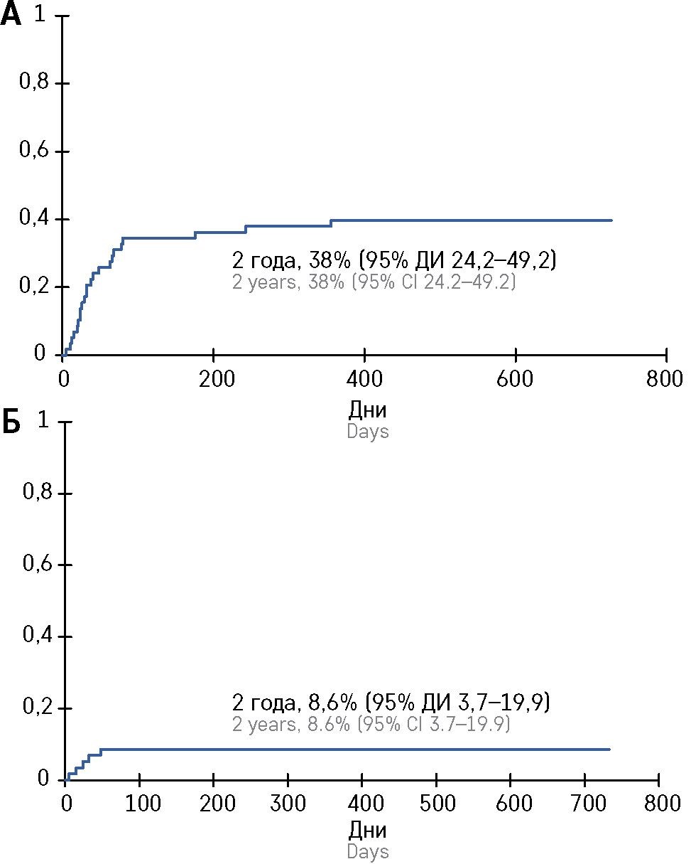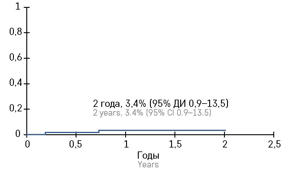 Трансплантат-ассоциированная смертность составила 1,7% (95% ДИ 0,9-13,5) на 100-й день и 3,4% (95% ДИ 0,9-13,5) через 2 года (рисунок 4).