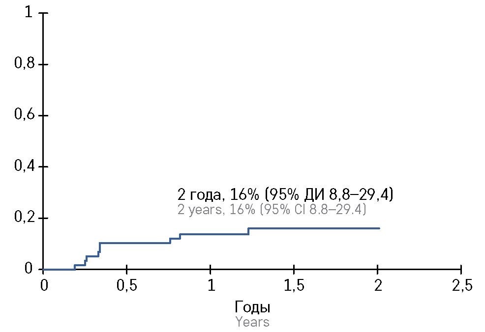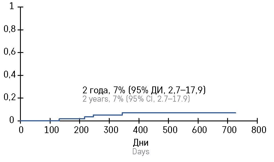 КР хронической РТПХ составил 7% (95% ДИ 2,7—17,9) (рисунок 2). Хроническая РТПХ развилась у 4 пациентов, у всех отмечалось поражение кожи, а в 1 случае дополнительно наблюдалось поражение легких. Два пациента с изолированным кожным поражением ответили на терапию низкими дозами глюкокортикостероидов и в настоящее время полу­чают местную терапию стероидами. Еще 1 пациент с кожным поражением и пациент с поражением легких продемонстрировали полный ответ на системную иммуносупрессивную терапию и на момент завер­шения сбора данных продолжают получать руксолитиниб.