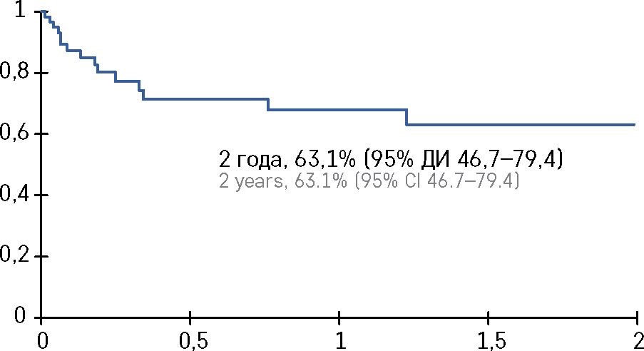 Двухлетняя ОВ составила 91% (95% ДИ 83,5­98,6), БСВ - 84,5% (95% ДИ 75,2-93,8) (рисунок 5). Выживаемость без РТПХ и рецидива составила 63,1% (95% ДИ 46,7-79,4) (рисунок 6).