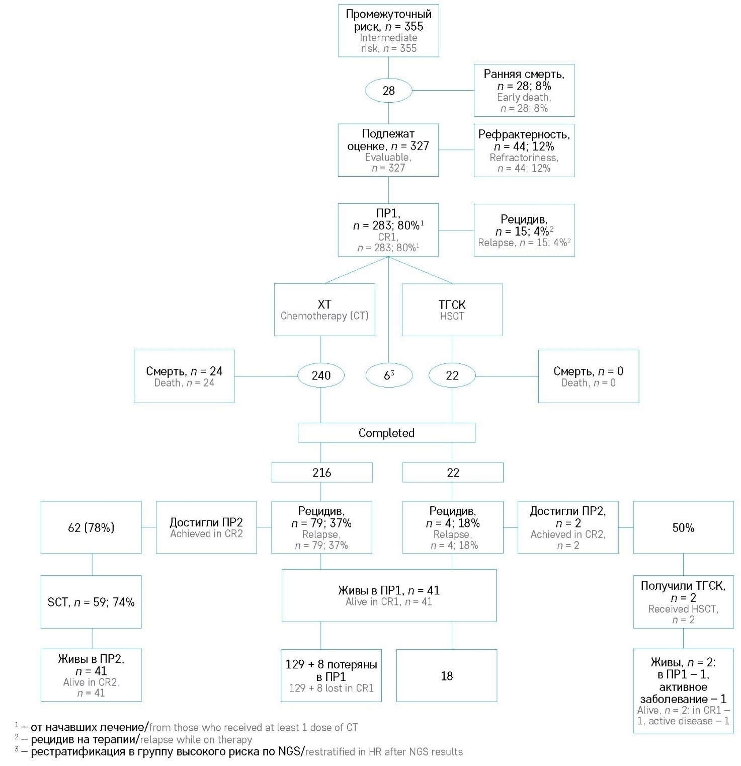 Двадцать четыре пациента (8%) умерли в ремиссии до возможного проведения ТГСК или последнего блока полихимиотерапии. Шесть пациентов в ходе терапии при получении данных NGS были рестратифицированы в группу высокого риска, все они получили ТГСК в первой ремиссии от альтернативного донора.