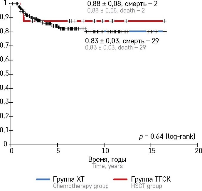 В то же время миелоаблативное кондиционирование при ОМЛ промежуточного риска, который является химиочувствительным вариантом заболевания, позволяет полагаться не только на иммунологические эффекты ТГСК, в значительной степени коррелирующие с развитием РТПХ, но и на, собственно, эрадикационный потенциал режима кондиционирования. Понимание этого позволяет оптимизировать (усилить, удлинить) профилактику РТПХ, не рискуя общим антилейкемическим эффектом трансплантации.