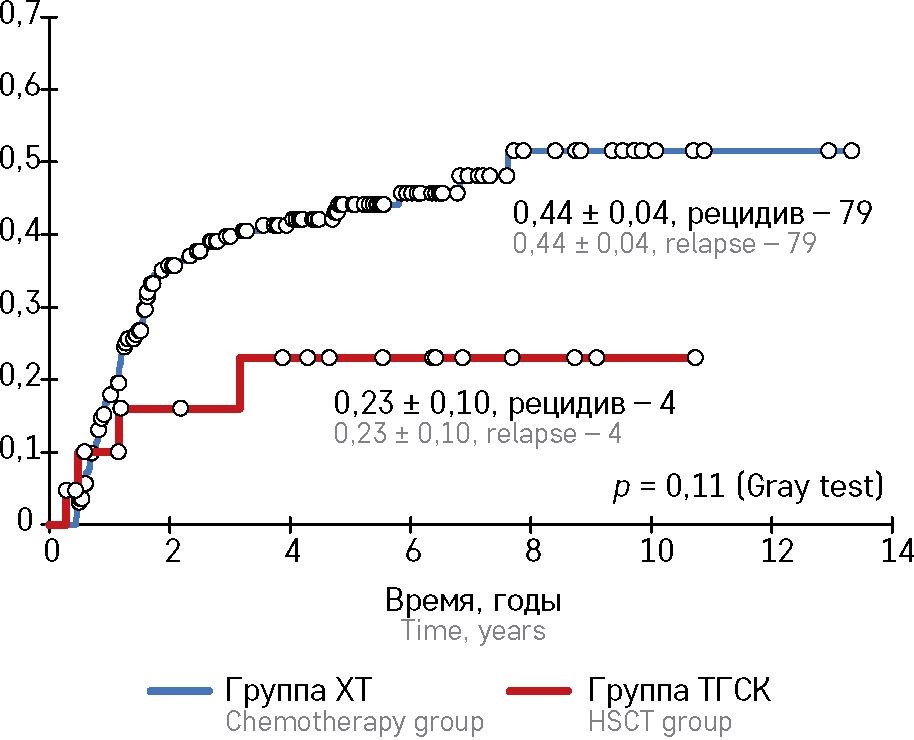 Из 216 пациентов, достигших ПР1, переживших осложнения высокодозной терапии и оставшихся в ПР1 после последнего курса ХТ, рецидив в дальнейшем развился в 79 (37%) случаях. КРР составил 0,44 ± 0,04 (рисунок 3).