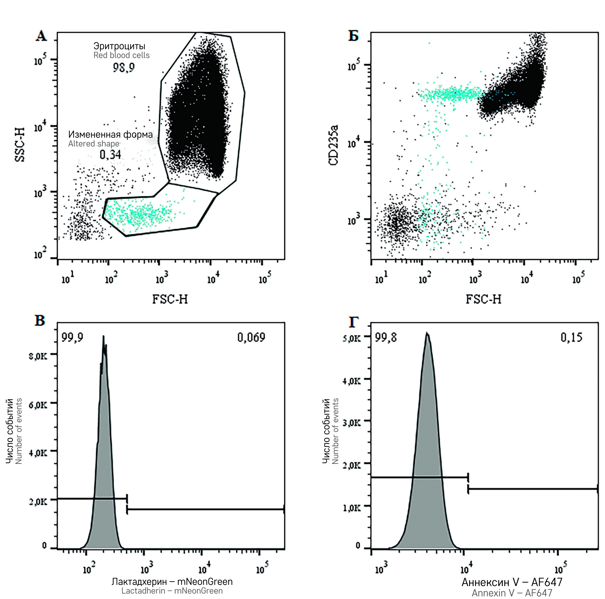 А - представлены стратегии гейтирования эритроцитов, а также выделения субпопуляции измененной формы (окрашена голубым); Б - в качестве контроля того, что события региона измененной формы являются эритроцитами, приведены результаты окрашивания образца эритроцитной взвеси антителами к гликофорину А (CD235a); В, Г - представлены стратегии выделения лактадхерин- и аннексин V-связывающих клеток соответственно