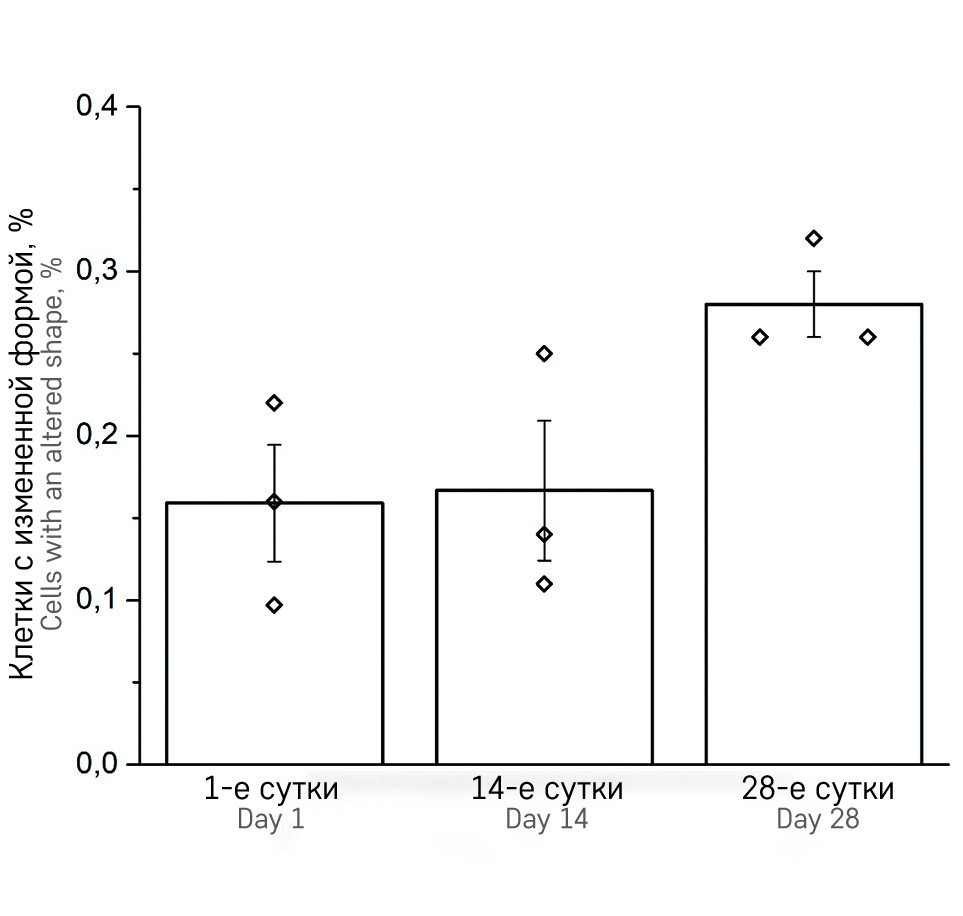 По данным цитофлуориметрического анализа с течением времени отмечался постепенный прирост субпопуляции клеток с измененными показателями прямого и бокового светорассеяния и клеток, потерявших свою дискоидную форму, вероятно, вследствие хранения (рисунок 2). Изменение формы клетки является одним из признаков протекания процесса программируемой клеточной гибели - эриптоза. При дисперсионном анализе между группами отмечена лишь тенденция к статистически значимому различию (р = 0,08), что, вероятно, объясняется малым размером выборки (п = 3).
