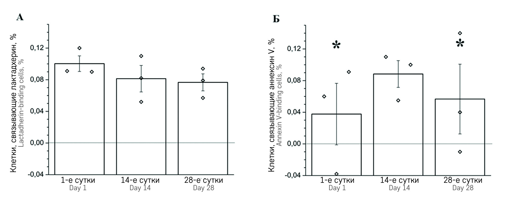 При исследовании уровня экспрессии фосфати- дилсерина при помощи лактадхерина и аннексина V видимой динамики изменения процента фосфатидил- серин-положительной субпопуляции эритроцитов не отмечалось вне зависимости от используемого маркера (рисунок 3). Однако результаты специфического связывания аннексина V (после вычитания процента фосфатидилсерин-положительных событий в контрольной пробе) достоверно не детектировались для измерений на 1-е (р = 0,45) и 28-е (р = 0,33) сутки.