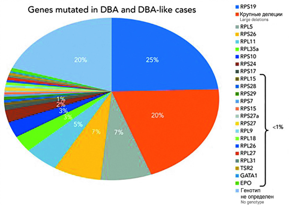 Анемия Даймонда-Блекфена (АДБ) - наследственный синдром недостаточности костного мозга, характеризующийся аплазией эритро цитарного ростка (часто в сочетании со скелетными аномалиями и низким ростом, которые классически проявляются в течение первого года жизни) в виде макроцитарно-нормохромной анемии и низким содержанием ретикулоцитов [1, 2]. По различным данным, частота встречаемости АДБ составляет 5-7 случаев на 1 млн новорожденных [2-5]. Диагноз устанавливается в среднем в возрасте 2-3 месяцев, при этом в 95% случаев АДБ диагностируется в возрасте до 2 лет, а в 99% - до 5 лет. В 13-16% случаев АДБ диагностируется при рождении [6]. Заболевание наследуется по аутосомно-доминантному типу. В основе патогенеза лежит апоптоз эритроидных предшественников в костном мозге вследствие дефекта биосинтеза рибосом. Генетические дефекты рибосомальных генов присутствуют примерно в 60-70% случаев АДБ и являются непосредственной причиной нарушения эритропоэза [2]. Наиболее часто, примерно в 25% случаев АДБ, встречаются поломки гена RPS19, который кодирует малую субъединицу рибосомального белка (RP) (рисунок 1) [7, 8].