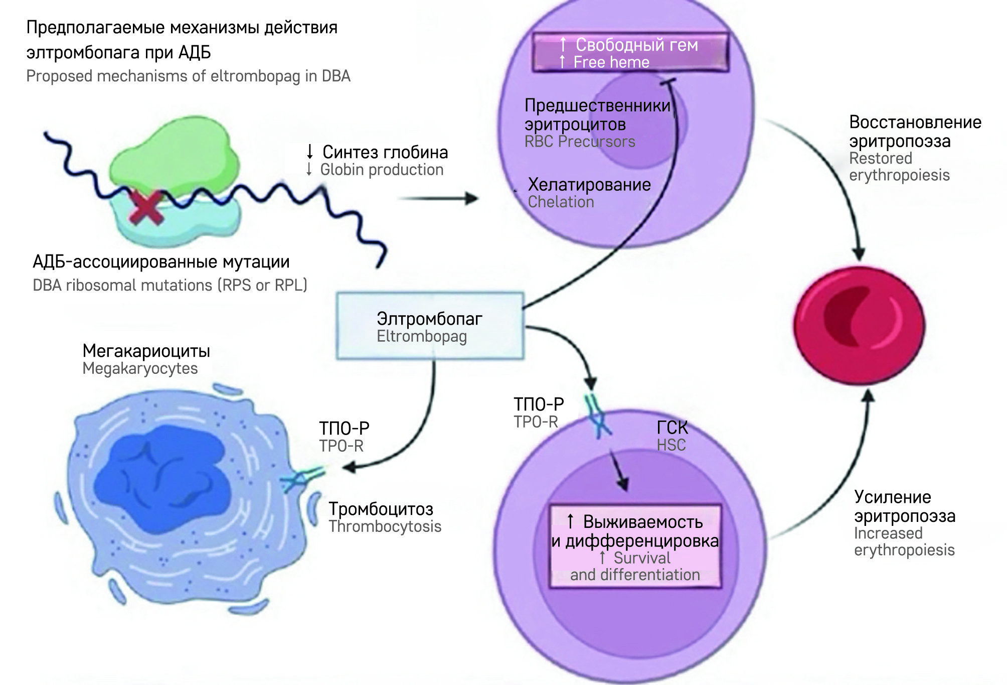 В предыдущих клинических и доклинических исследованиях были получены убедительные доказательства стимуляции эритропоэза при применении элтромбопага. Каков ведущий механизм в реали­зации данного эффекта, пока неясно. Возможно, это связано со способностью элтромбопага к связыванию внутриклеточного железа, тем самым восстанавливая баланс между синтезом гема и глобина и предотвращая апоптоз. Однако в таком случае неясно, почему терапия классическими хелаторами (деферазирокс, дефероксамин), которую получают почти все больные АДБ, не приводит к гематологическому ответу. Связано ли это с особенностями хелатирующих свойств элтромбопага или с чем-то другим - предстоит изучить. С другой стороны, давно известно, что элтромбопаг может непосредственно стимулировать ГСК и прогениторные предшественники [24], вследствие чего, возможно, происходит заполнение эритроидного «отсека» в костном мозге. Данный механизм может реализовываться у пациентов с мутацией гена RPS19, при которой, как показано, наблюдается снижение пролиферации клеток-предшественников, а конечная дифференцировка эритро­цитов остается ненарушенной [31] (рисунок 2). Либо же имеет место сочетание двух вышеупомянутых механизмов, что позволяет добиться гематологического ответа у пациентов с АДБ.