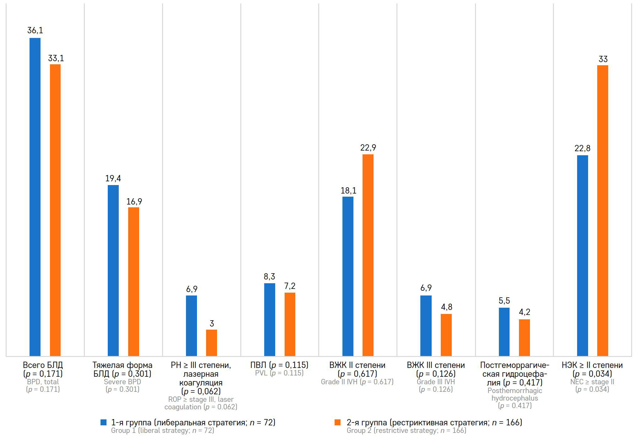 Статистически значимых отличий в частоте БЛД, в том числе тяжелой формы, ПВЛ, ВЖК > II степени в исследуемых группах не выявлено. Частота НЭК > II степени во 2-й группе по сравнению с 1-й группой была выше, отношение шансов = 1,6 (95% доверительный интервал 1,1-2,6), р = 0,034.