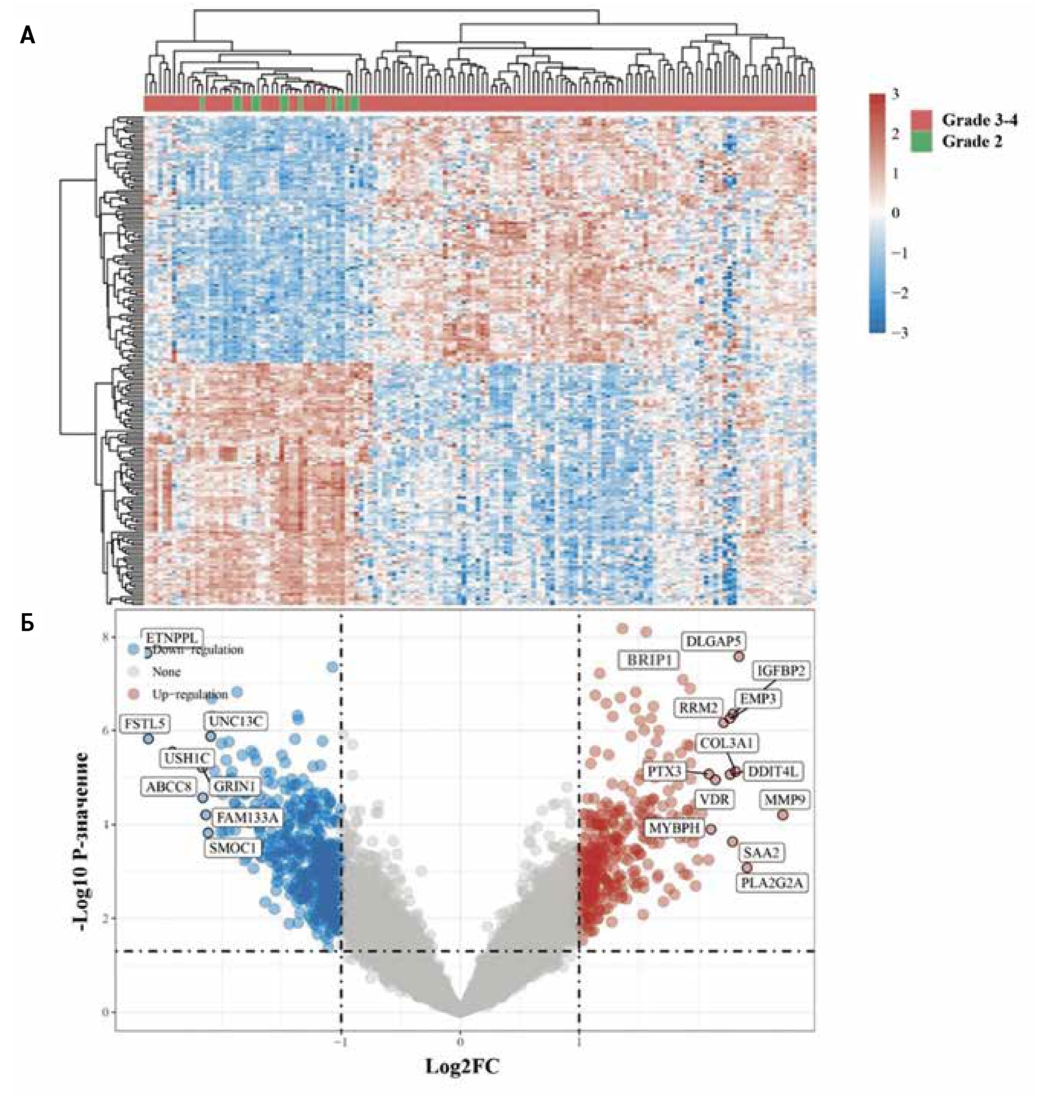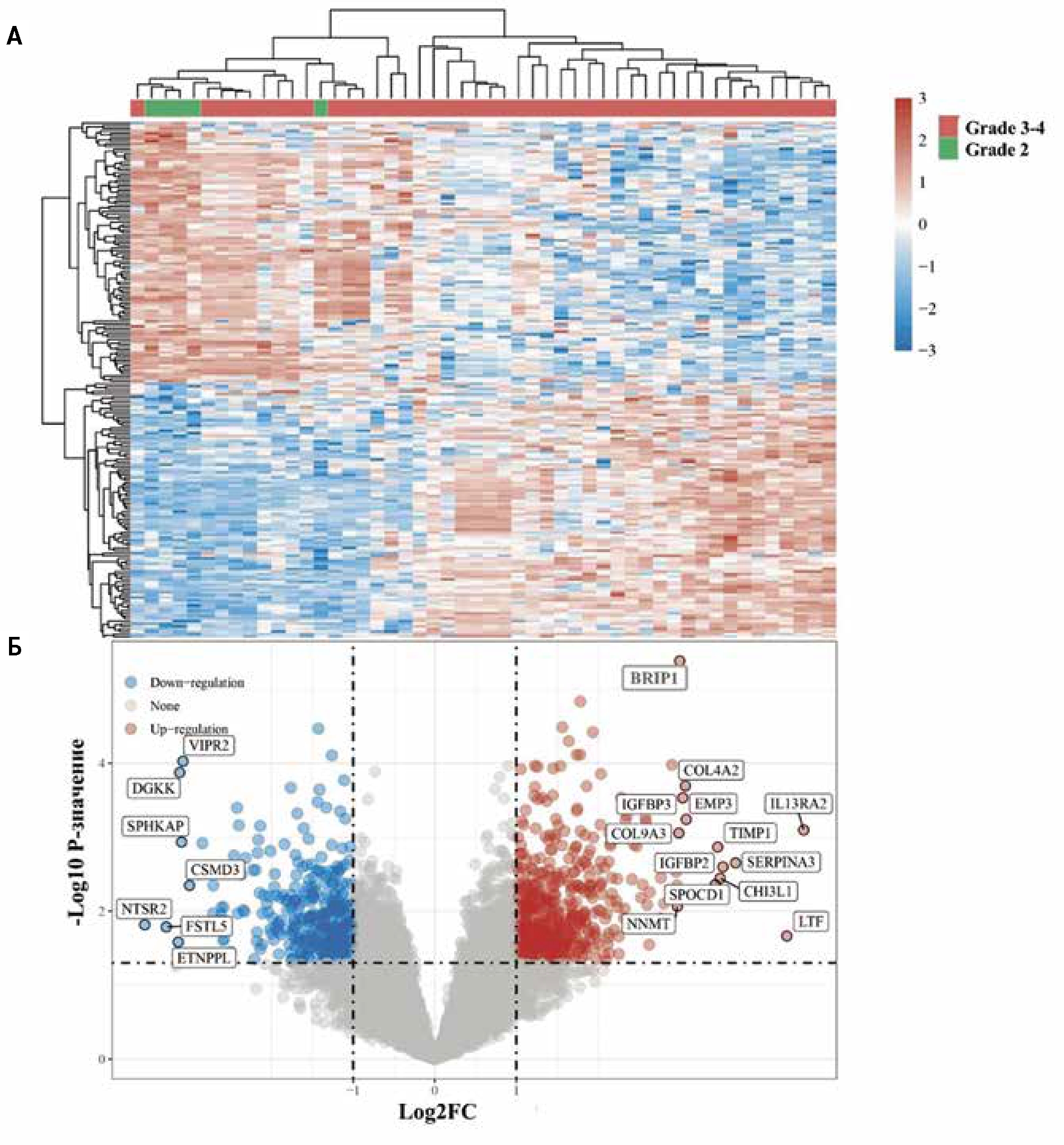 A – a heatmap and Б – a volcano plot showing the expression profile of 798 differentially expressed genes (DEGs) based on the GSE54004 dataset. The colors represent high (red) and low (blue) gene expression levels
