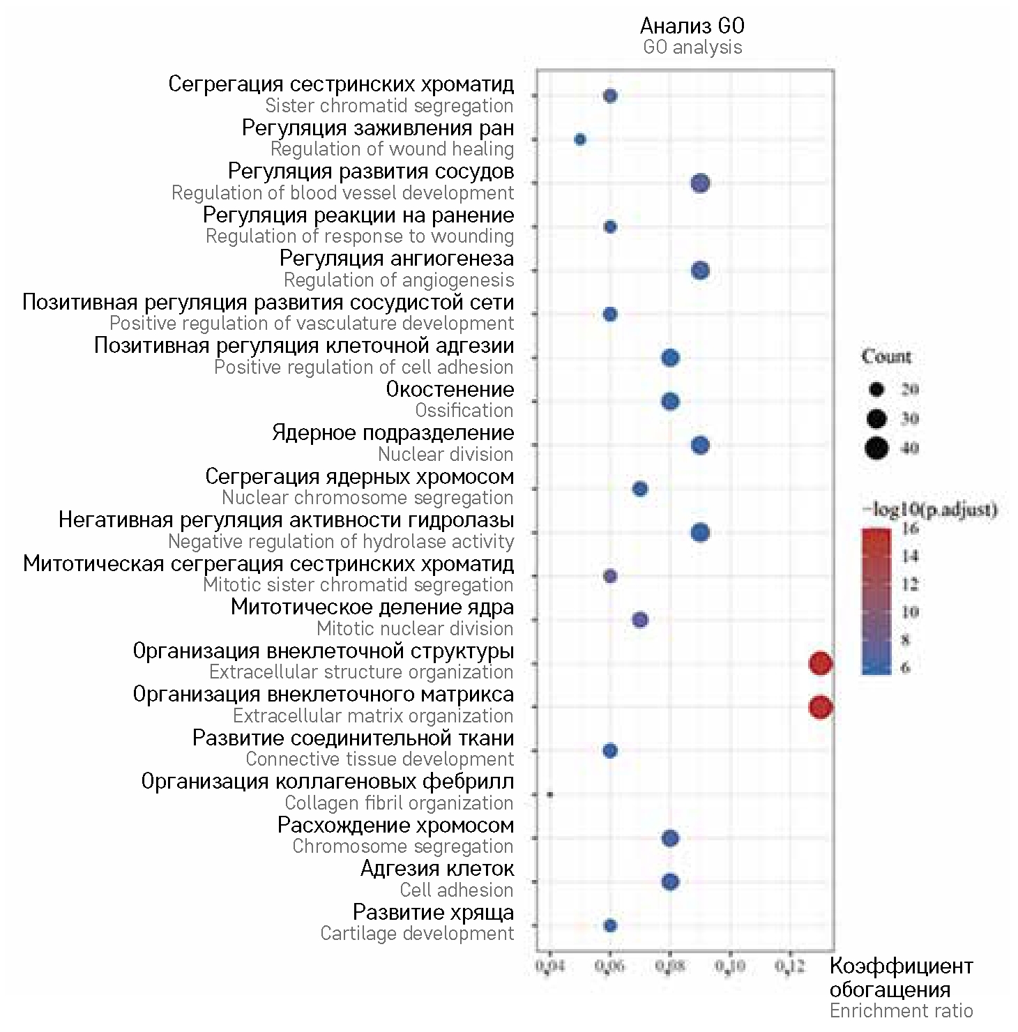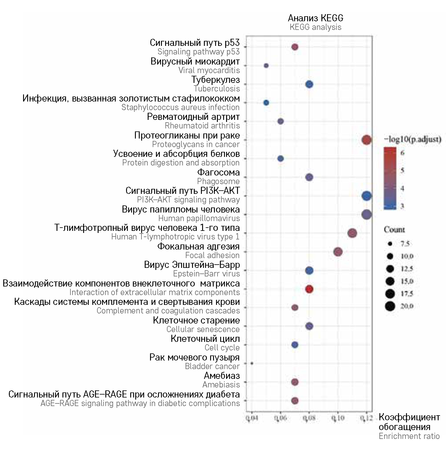 Для анализа GO и KEGG использовались общие 200 DEGs c высоким уровнем экспрессии. Анализ GO и KEGG показал, что DEGs с повышенной экспрессией в основном участвовали в регуляции таких процессов, как регуляция развития сосудов, ангиогенеза, ядерное подразделение, негативная регуляция активности гидролазы, организация внеклеточной структуры, внеклеточного матрикса, протеогликаны при раке и сигнальный путь PI3K-AKT, вирус папилломы человека, Т-лимфотропный вирус человека 1-го типа, фокальная адгезия и взаимодействие компонентов внеклеточного матрикса (рисунки 3, 4).