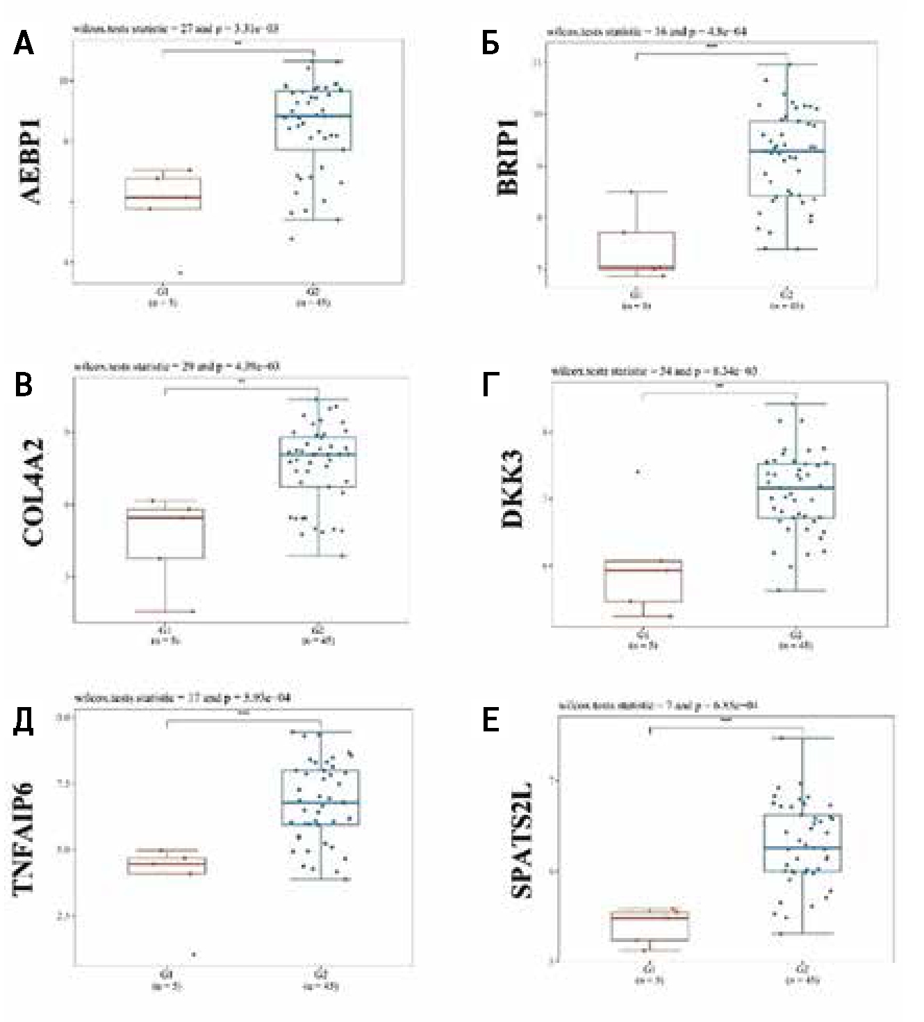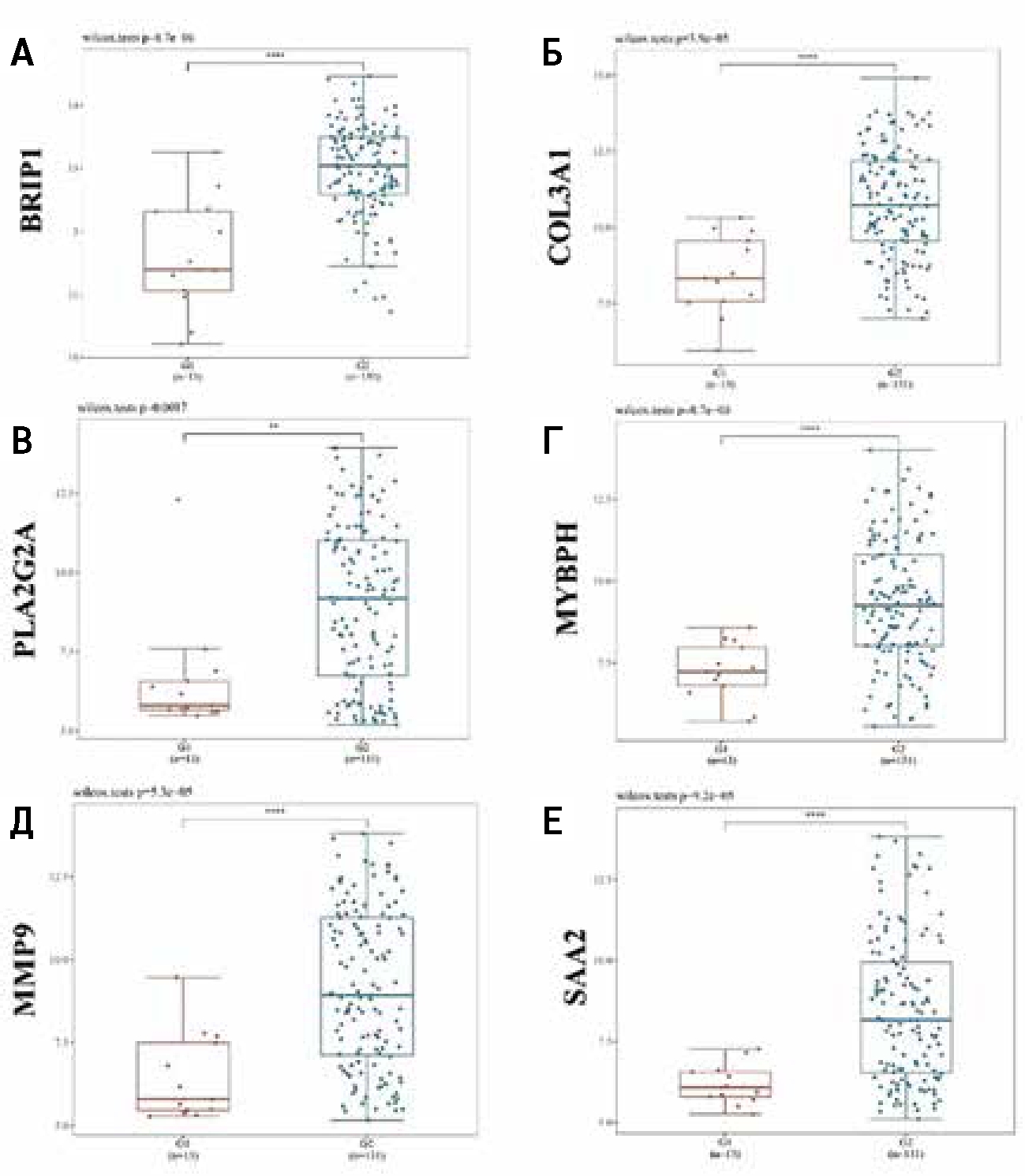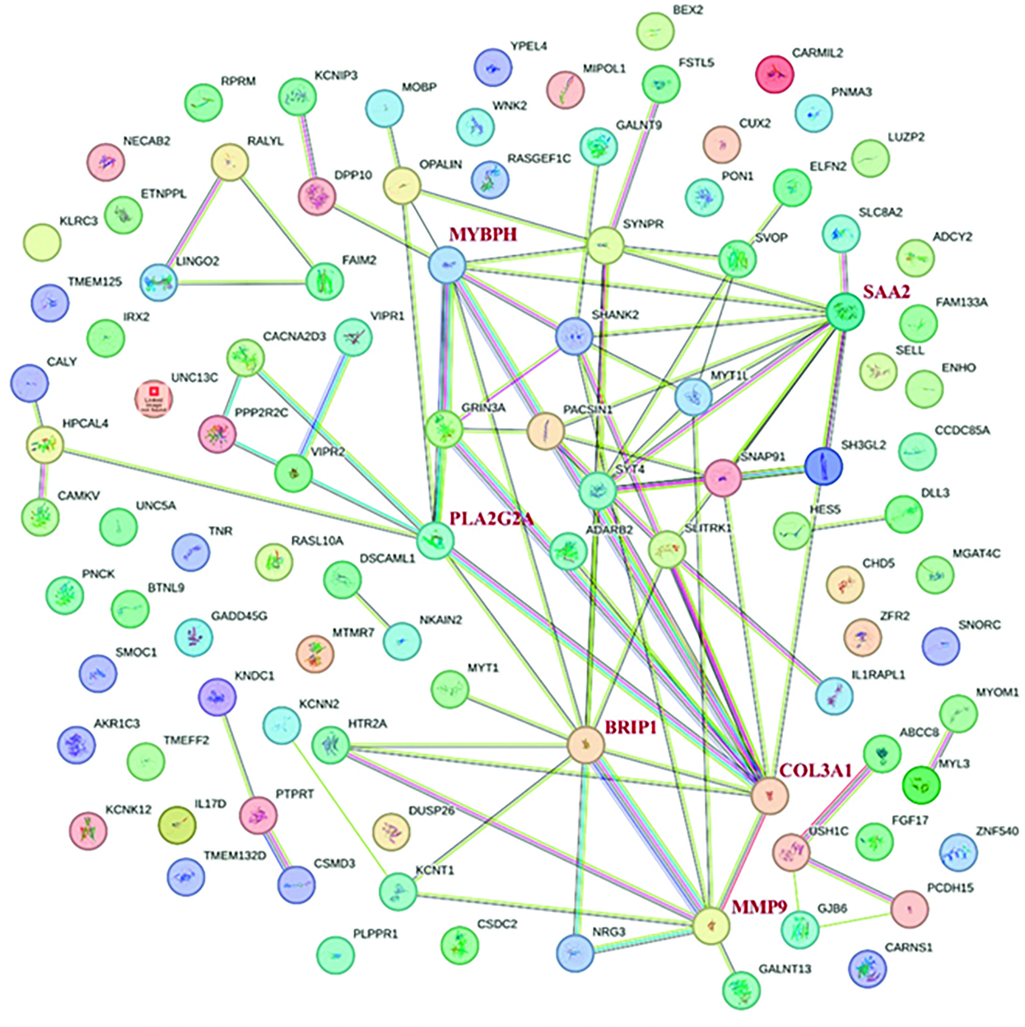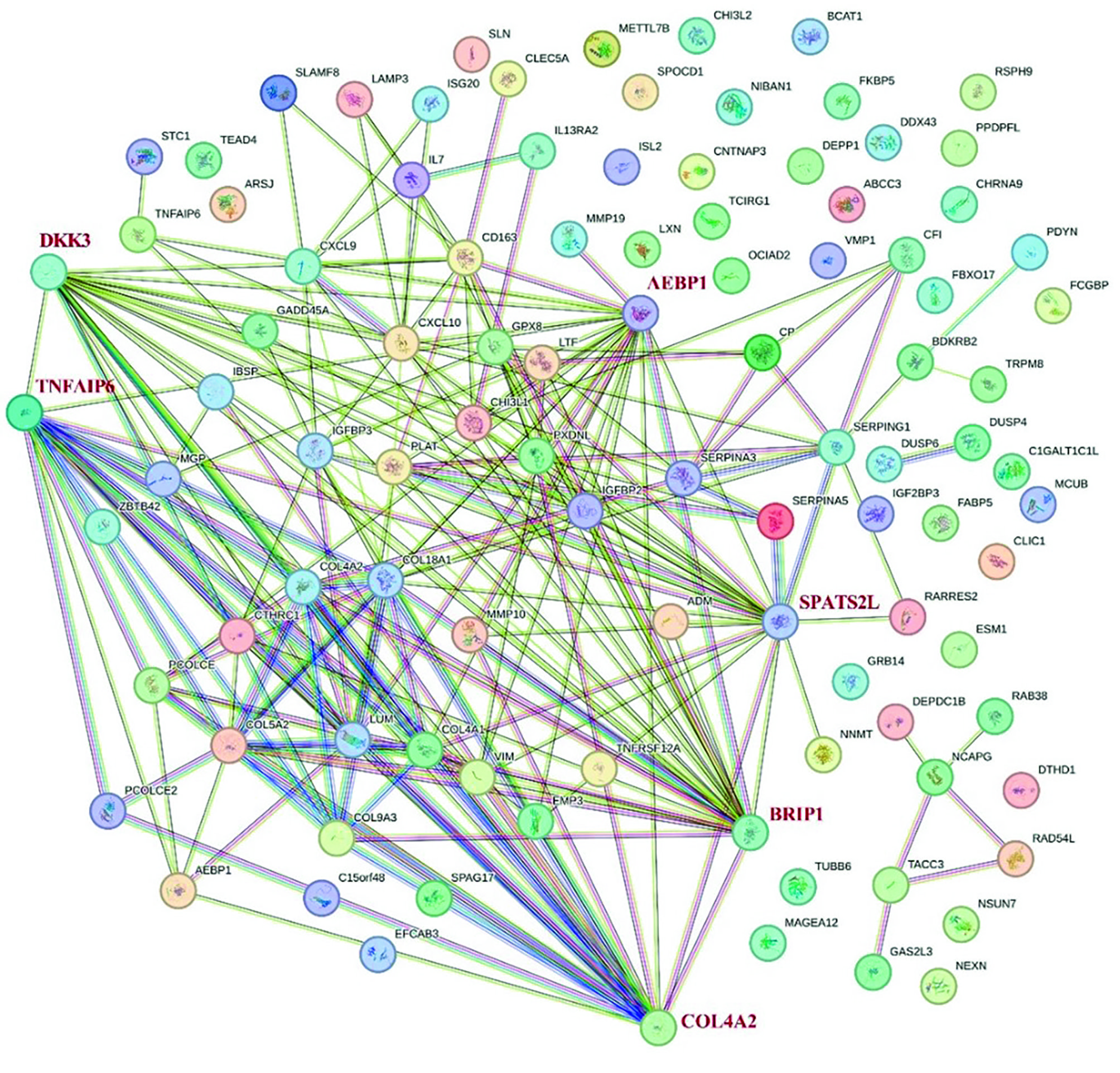 Сеть PPI для 100 генов с наиболее высокой экспрессией из каждого набора данных была построена с использованием базы данных STRING (версия 12.0), которая включает: из данных GSE54004 – 100 узлов и 86 ребер со средней степенью узла 4,42 и значением p < 1,0e–16 и из данных GSE43378 – 100 узлов и 219 ребер со средней степенью узла 4,38 и значением p < 1,0e–16 (рисунки 5, 6, таблицы 1, 2). Затем программное обеспечение Cytoscape и плагин cytoHubba были использованы для поиска ключевых генов в сети PPI DEGs. В общей сложности по 6 лучших генов, ранжированных по степени, были идентифицированы как ключевые из 2 баз данных. В результате было выявлено 11 ключевых/ топ-генов с повышенной экспрессией: из набора данных GSE54004 – BRIP1, коллаген типа III, альфа 1 (collagen type III alpha 1 chain, COL3A1), мембраноассоциированная фосфолипаза A2 (phospholipase A2, membrane associated, PLA2G2A), миозинсвязывающий белок H (myosin binding protein H, MYBPH), MMP9 и белок сывороточного амилоида А (serum amyloid A protein, SAA2); из набора данных GSE43378 – белок 1, связывающий А (AE binding protein 1, ЕAEBP1), BRIP1, коллаген, тип IV, альфа 2 (сollagen, type IV, alpha 2, COL4A2), белок 3, связанный с Dickkopf (Dickkopfrelated protein 3, DKK3), белок гена 6, индуцируемый фактором некроза опухоли альфа (tumor necrosis factor alpha induced protein 6, TNFAIP6) и cперматогенезaссоциированный cеринподобный rich 2 (spermatogenesis associated serine rich 2 like, SPATS2L).
