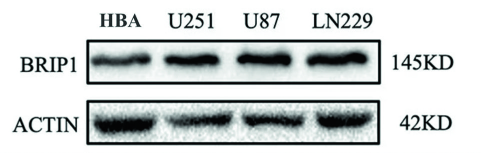 Образцы клеток лизировали в буфере для радиоиммунопреципитационного анализа с добавлением 0,1 ммоль/л коктейля ингибиторов протеазы, ортованадата натрия и фенилметилсульфонилфторида. Лизат инкубировали на льду в течение 30 мин и встряхивали каждые 10 мин, затем центрифугировали при 17 000g в течение 15 мин для сбора белков. Конечную концентрацию белка в супернатанте определяли с помощью реагента для анализа белка Бредфорда. Равные количества белка (~40 мкг) кипятили в течение 5 мин в равном объеме восстанавливающего буфера, разделяли на 8% полиакриламидных гелях и электроблотировали на нитроцеллюлозных мембранах. Мембраны были исследованы с помощью первичных антител anti-BRIP1 (разведение 1:500, Abcam: abID#151509) и anti-ACTIN (разведение 1:200), а затем вторичных антител goat anti-rabbit IgG-HRP (разведение 1:10 000). Иммунореактивность была обнаружена с помощью хемилюминесценции. Для получения относительной количественной оценки экспрессии BRIP1 на уровне белка изображения, полученные с помощью вестерн-блоттинга, были проанализированы с помощью программного обеспечения ImageJ. Интенсивность полос BRIP1 относительно полос ACTINA была использована для расчета относительной экспрессии этого гена в каждой клеточной линии глиом.