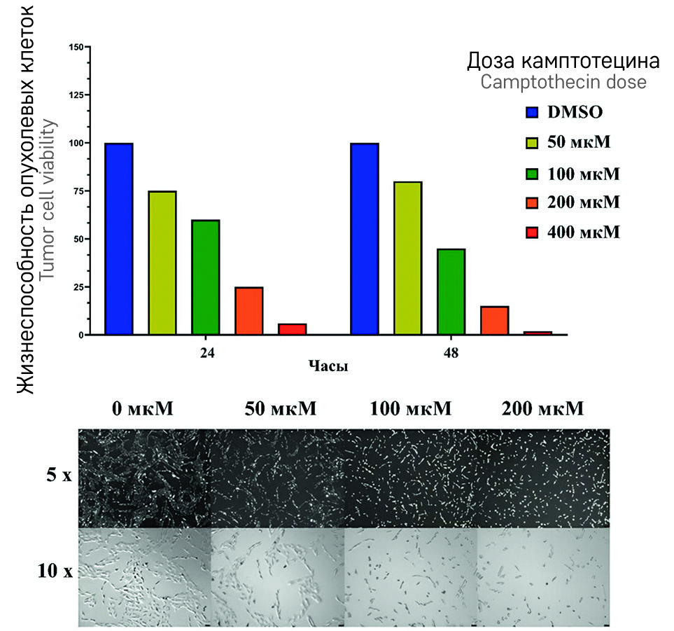 Цитотоксичность синтезированного камптотецина оценивали в отношении клеточной линии глиом U251 с помощью анализа с 3-(4,5-диметилтиазол-2-ил)-2,5дифенилтетразолийбромидом (МТТ). Клеточную линию глиом U251 обрабатывали различными дозами/ концентрациями камптотецина (0, 50, 100, 200 и 400 мкм) в течение 24 и 48 ч. Затем в каждую лунку добавляли 100 мкл МТТ в дозе 5 мг/мл (Roche Diagnostics, Шанхай, Китай) и дополнительно инкубировали в течение 2 ч при 37°C. Супернатант удаляли, и в лунки добавляли 200 мкл 0,1% диметилсульфоксида (DMSO) для растворения фиолетовых кристаллов формазана. Количественную оценку проводили путем измерения поглощения при 540 нм с помощью просвечивающей электронной микроскопии. Результаты представлены как средние значения из 3 независимых экспериментов, проведенных в 3 повторах.