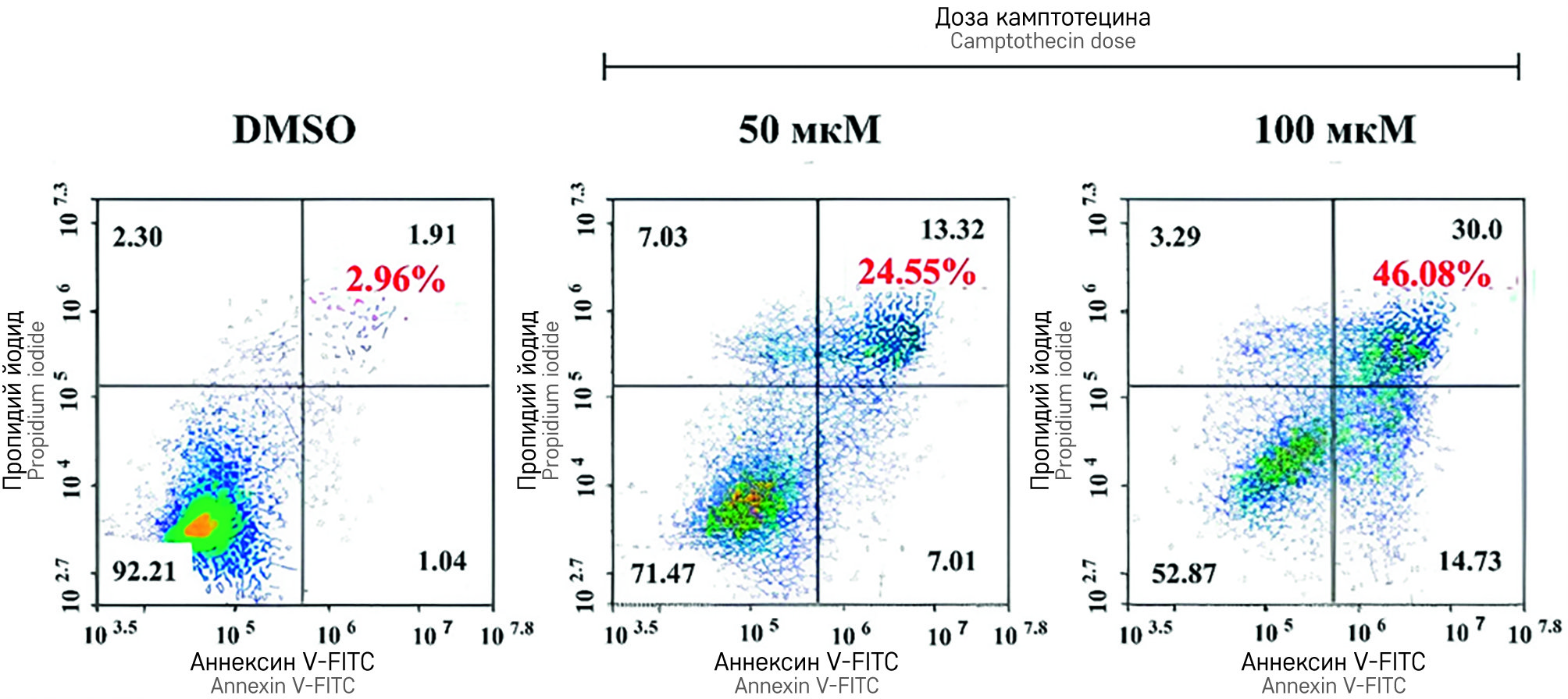 Клеточную линию глиом U251 высевали с плотностью 3 × 105 клеток/лунку в 6-луночные планшеты, инкубировали в течение ночи, а затем обрабатывали 2 различными дозами/концентрациями (50 и 100 мкМ) камптотецина и 200 мкл 0,1% DMSO, где клеточная линия U251 считалась контрольной группой. Через 48 ч обработки клетки трипсинизировали, промывали 1 раз PBS, а затем суспендировали в 1 связывающем буфере. Затем к каждому образцу добавляли аннексин V – флуоресцеин-5-изотиоцианат (FITC) (5 мкл) и пропидий йодид (PI) (5 мкл) (KeyGen Biotech, Китай), после чего инкубировали в течение 15 мин при комнатной температуре в темноте. Клетки анализировали с помощью проточной цитометрии (BD Biosciences, Сан-Хосе, Калифорния, США), скорость апоптоза клеток – с помощью пакета программного обеспечения FLOWJO для анализа данных проточной цитометрии (v10; BD Biosciences).
