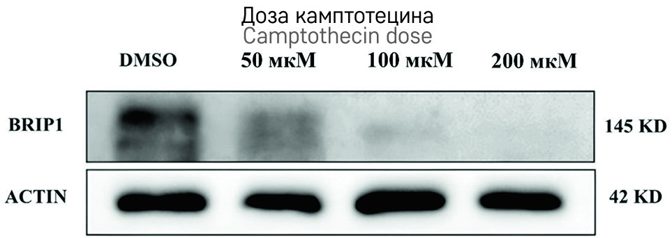 Чтобы оценить влияние камптотецина на активность BRIP1, мы исследовали его экспрессию на уровне белка с помощью вестерн-блотанализа. Мы наблюдали, что активность BRIP1 снижается при увеличении дозы камптотецина (рисунок 17).